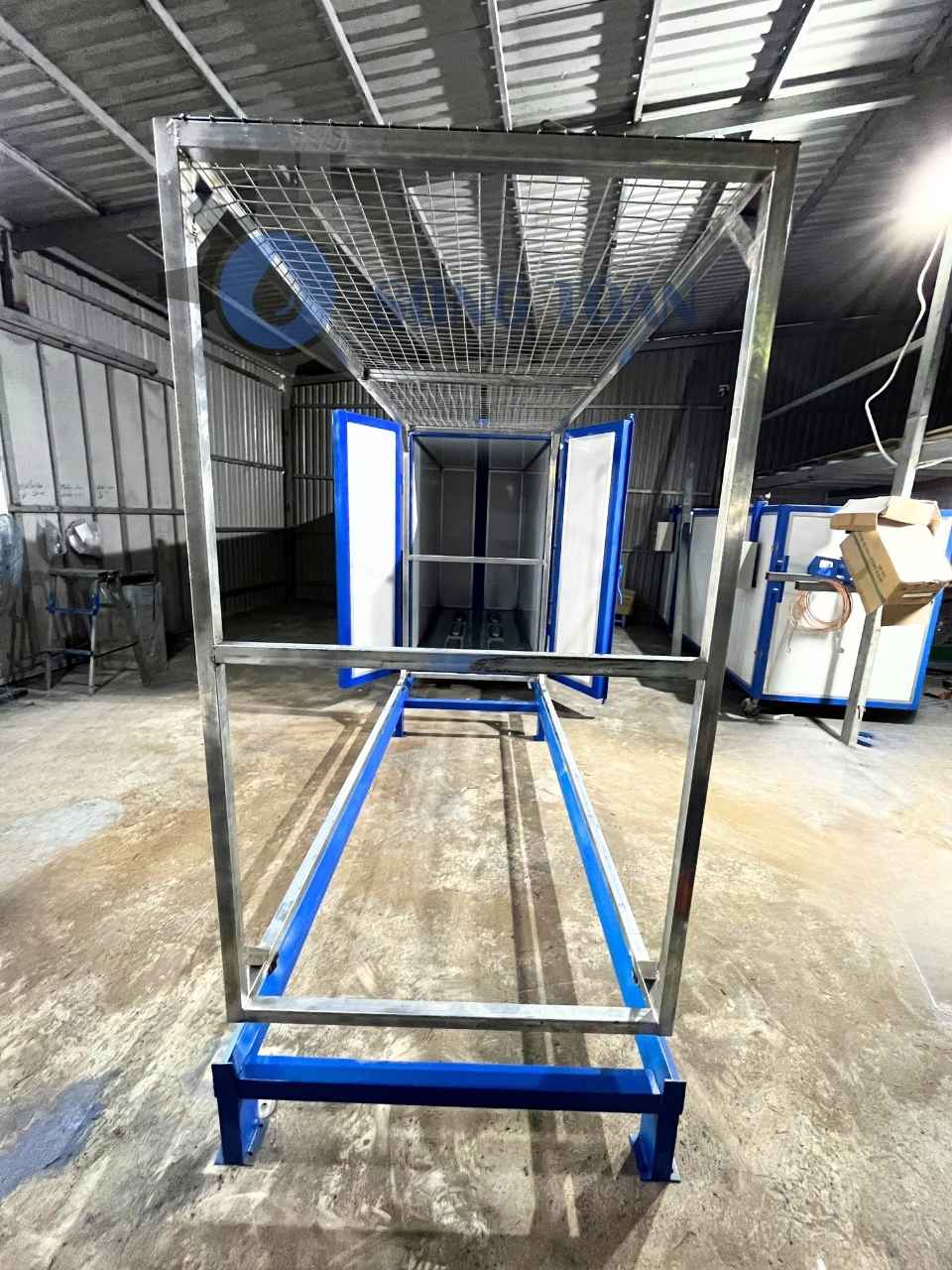- Các bộ phận đi kèm: Bánh xe dễ dàng di chuyển, thanh trượt và khung treo sản phẩm, bộ tủ điện điều khiển.