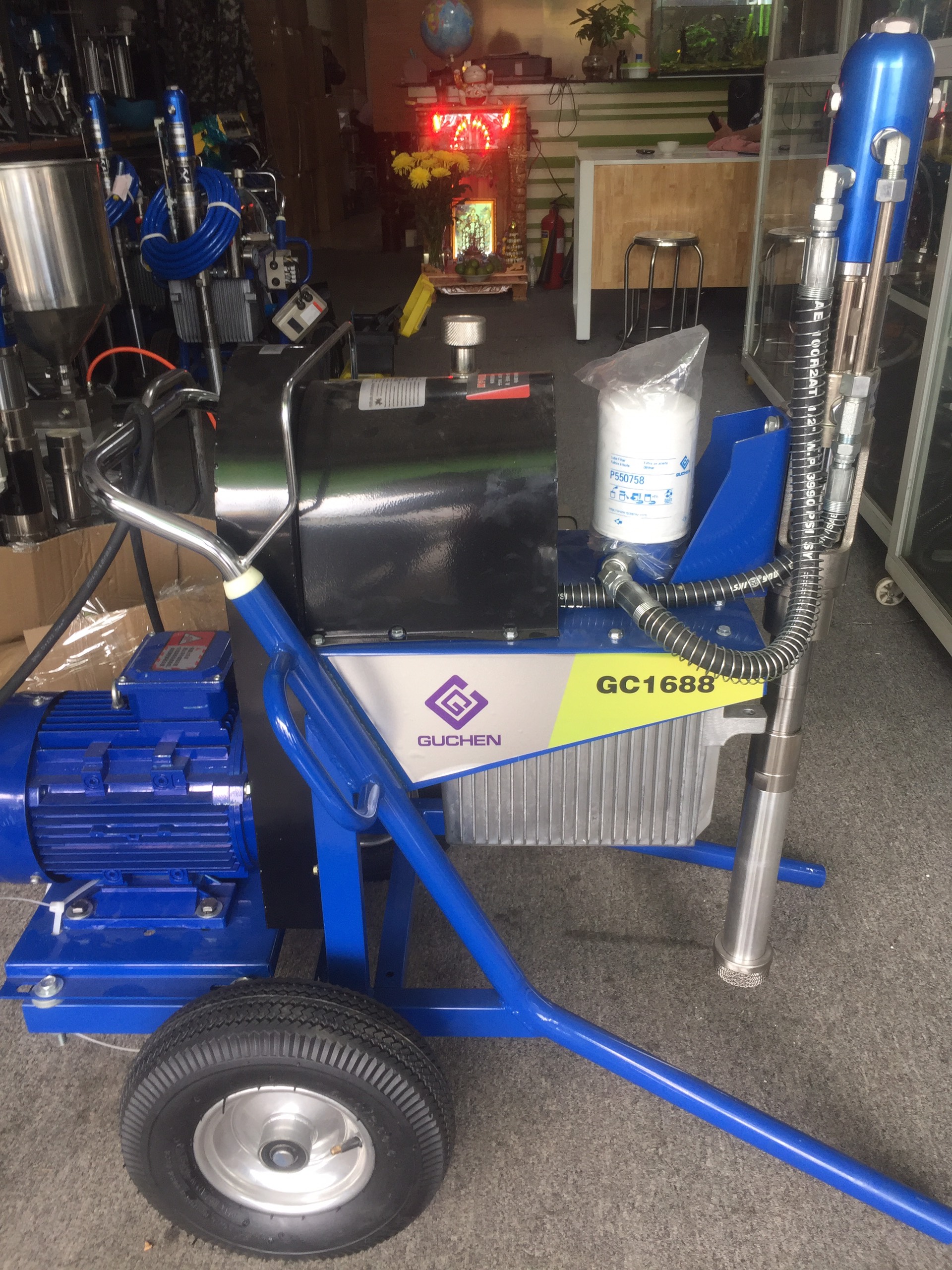 -Thay vì trét bột matit lên tường theo kiểu truyền thống thì máy phun bột trét chỉ cần 1 thao tác là dùng vòi súng phun bột kết hợp máy phun bột trét GC-1688 trét lên tường