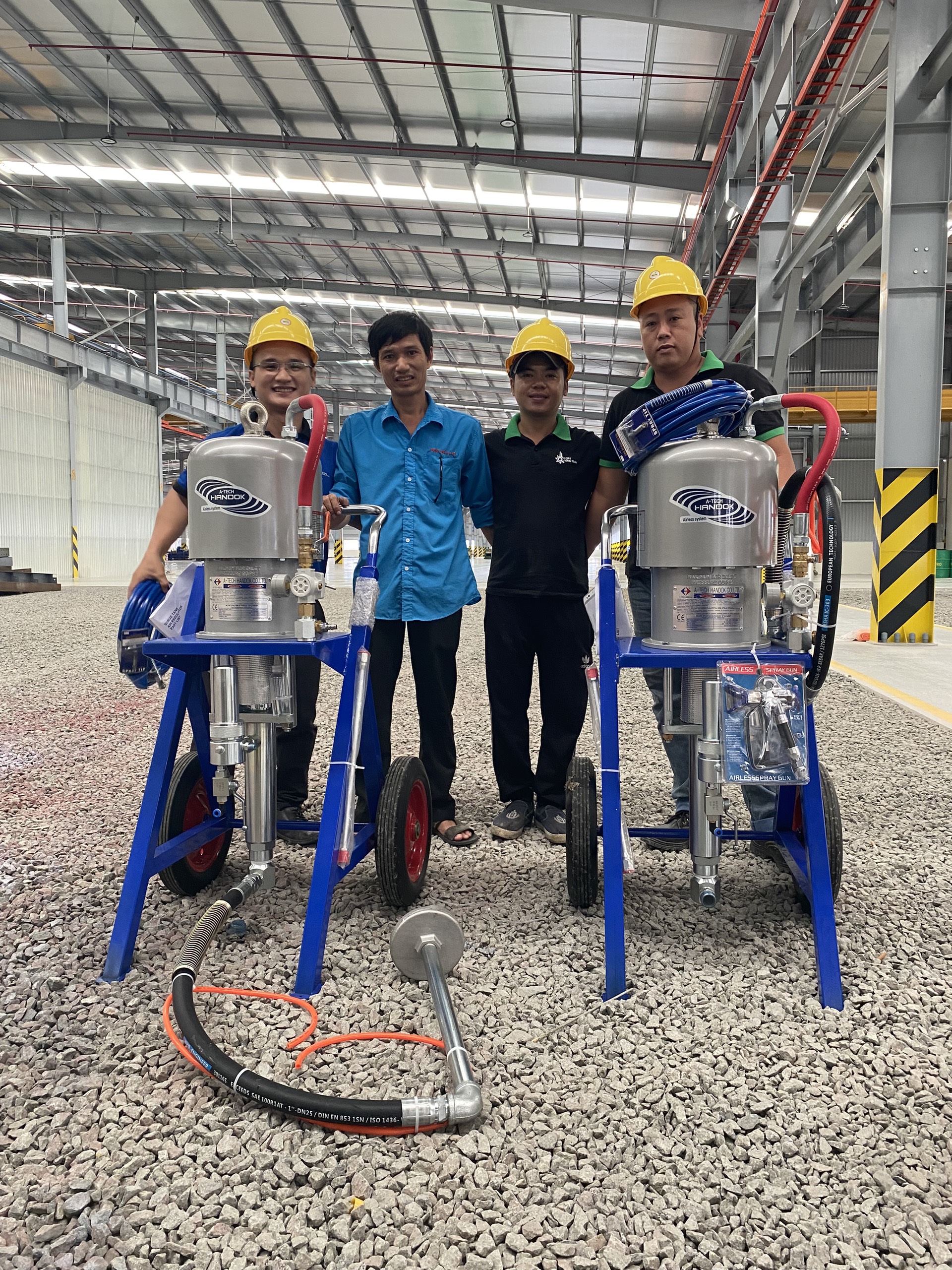 - Sơn sàn gara, tầng hầm, nhà xưởng: Máy được sử dụng để thi công phun sơn sàn cho các nhà xưởng trong khu công nghiệp, bãi xe, gara, kho lạnh, đảm bảo bề mặt bóng, và dễ dàng vệ sinh.
