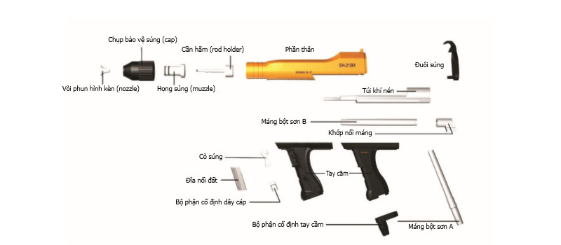 (Cấu tạo chi tiết của bộ súng phun sơn tĩnh điện bột SOOHO SH-210)