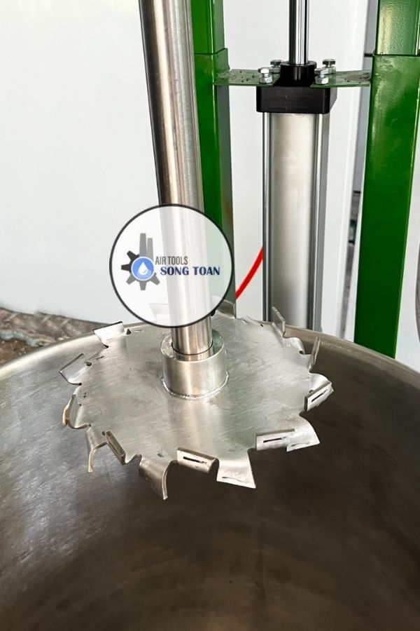 Một trong những ưu điểm nổi bật của sản phẩm là hệ thống nâng hạ tự động bằng ben khí nén có hành trình lên đến 900mm, giúp việc điều chỉnh chiều cao của trục khuấy trở nên đơn giản và nhanh chóng. Hệ thống ben khí nén không chỉ giúp tiết kiệm sức lao động mà còn tăng độ chính xác trong việc đưa trục khuấy vào đúng vị trí cần thiết, nâng cao hiệu quả khuấy trộn và đảm bảo sự đồng nhất của nguyên liệu trong thùng.