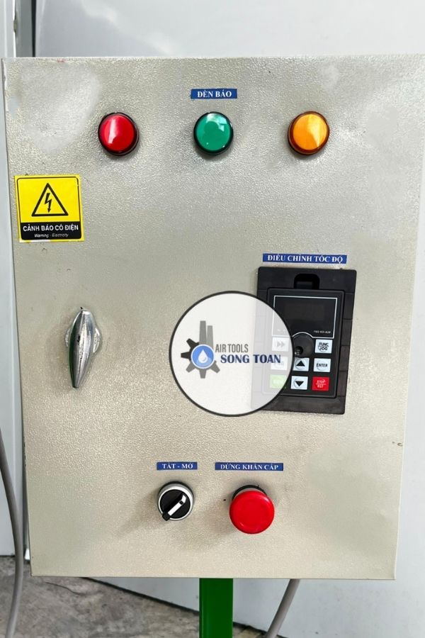 Máy được trang bị hệ thống điện 380V chuyên dụng, tích hợp tủ điều khiển thông minh, giúp người vận hành dễ dàng kiểm soát tốc độ khuấy một cách linh hoạt. Điểm nổi bật là biến tần 5HP cho phép điều chỉnh tốc độ motor từ 0 đến 1500 vòng/phút, phù hợp với nhiều loại vật liệu có độ nhớt và tính chất khác nhau.