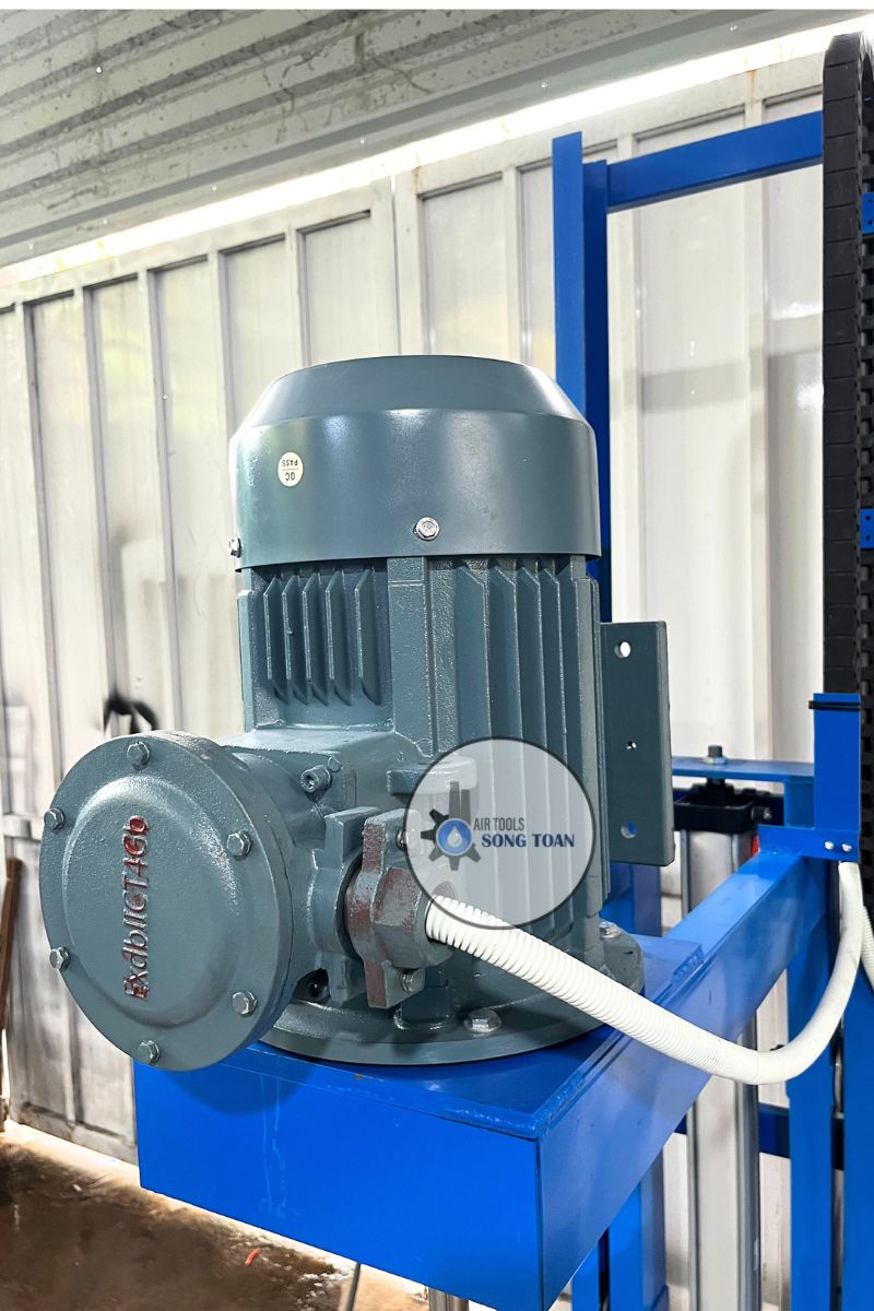 - Motor chống cháy nổ: Đây là điểm cộng vượt trội của thiết bị. Được sản xuất theo tiêu chuẩn chống cháy nổ , motor có khả năng hoạt động an toàn trong môi trường có khí dễ cháy, bụi hóa chất hoặc dung môi hữu cơ. Điều này đặc biệt quan trọng trong các nhà máy hóa chất, xăng dầu, nhà máy sơn và dung môi.