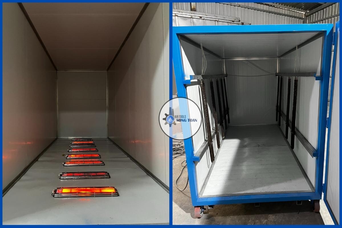 - Buồng sấy dùng điện: Nhiệt độ ổn định hơn và dễ dàng kiểm soát, giúp bảo vệ chất lượng lớp sơn và đảm bảo độ bền của sản phẩm.